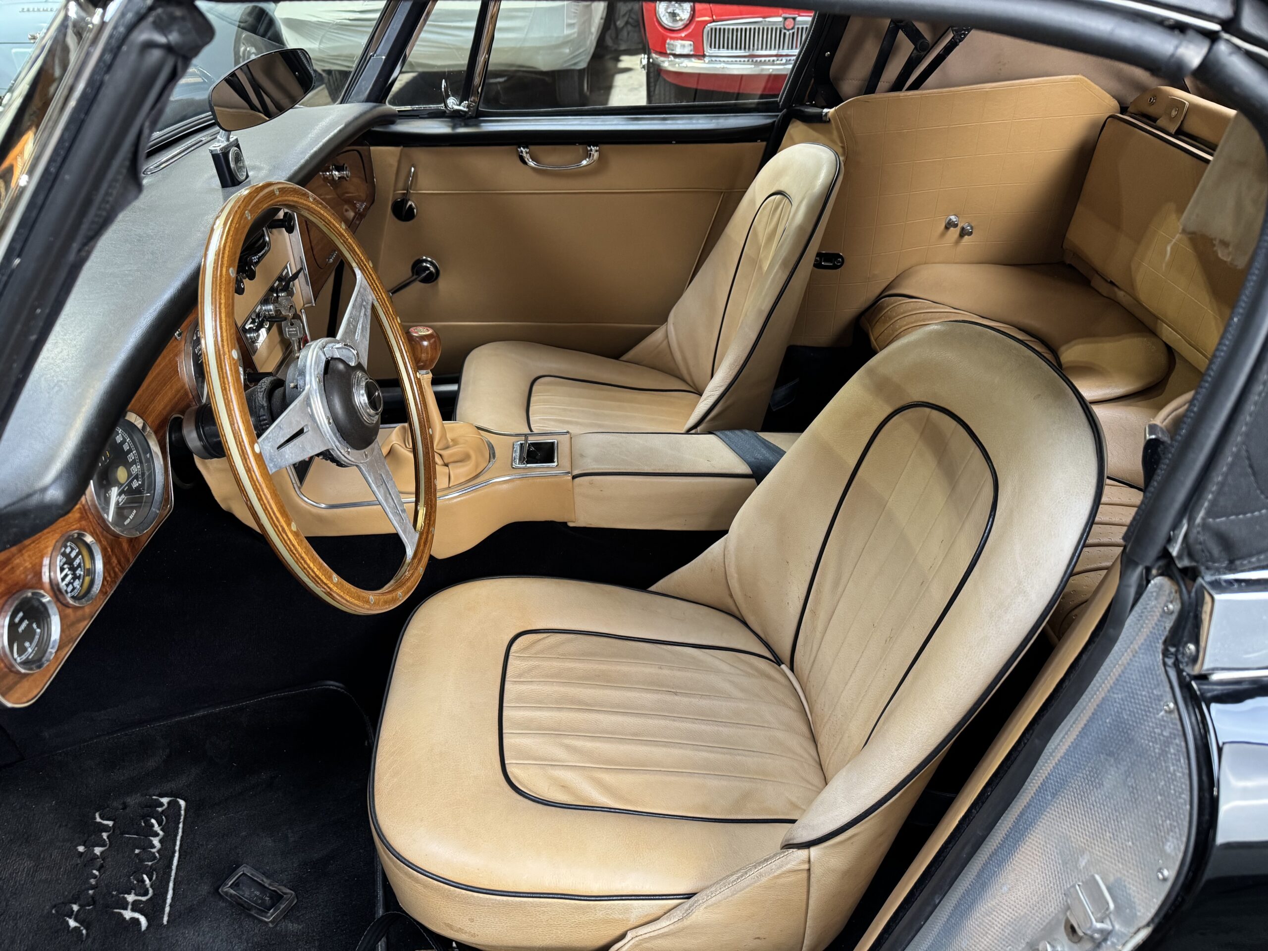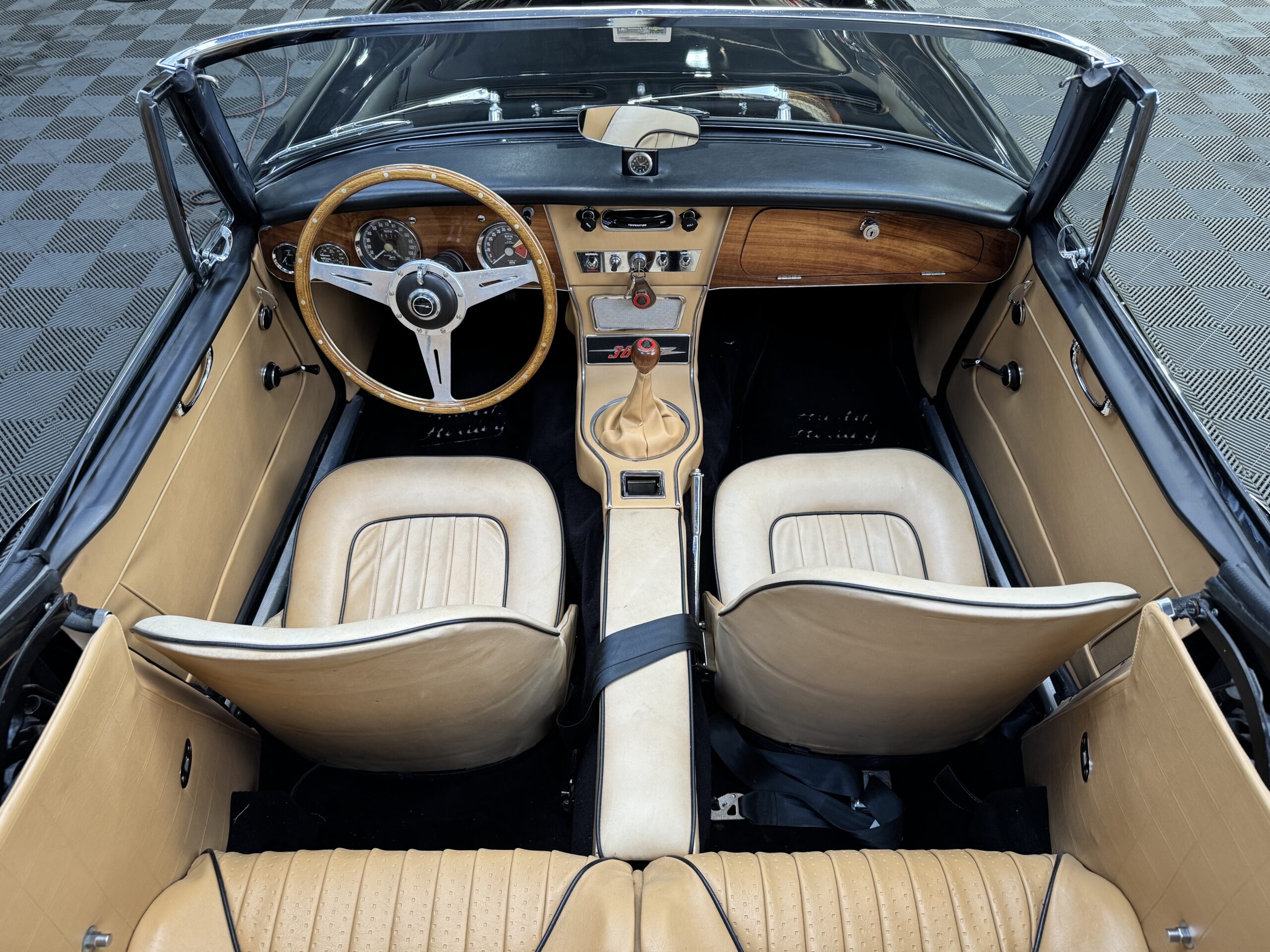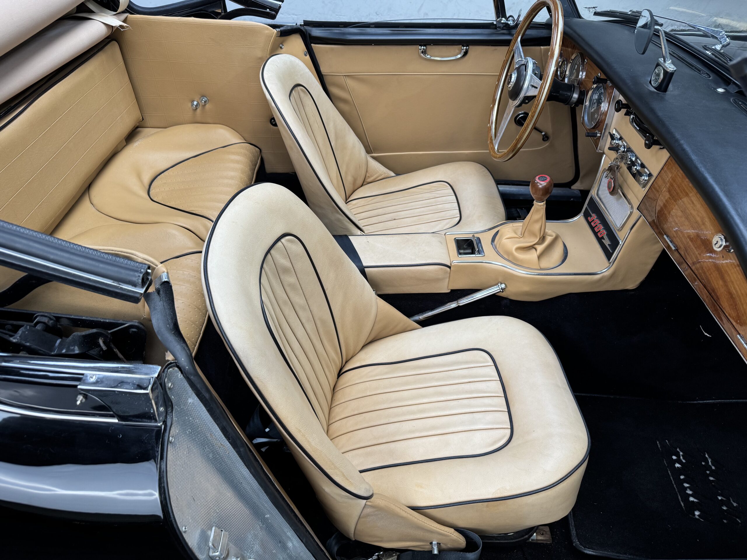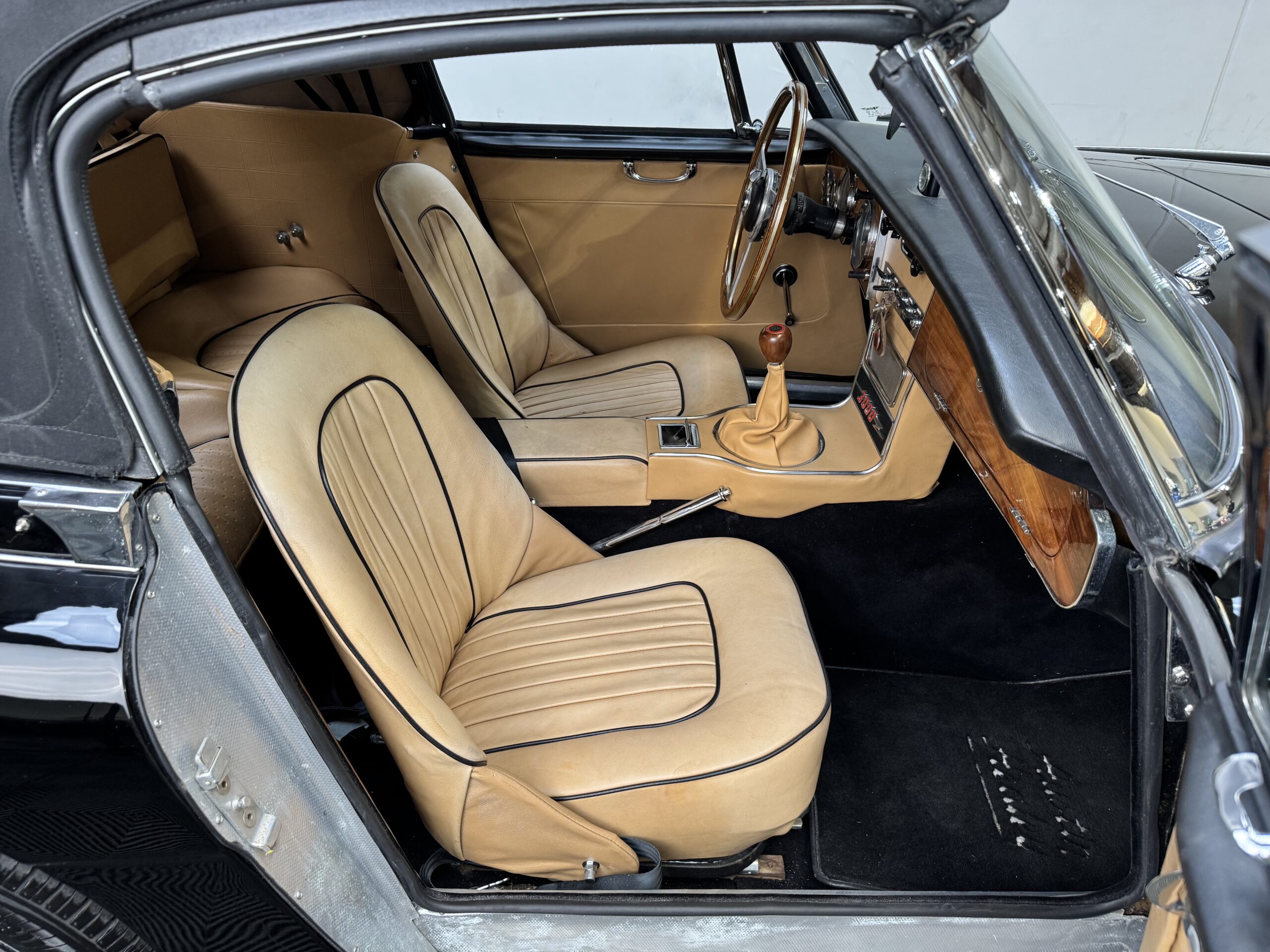 -Newer upholstery throughout including front and rear seats with foam kit, matching biscuit panel kit, black cut pile carpet kit, console, armrests, armbars, seat belts, new wooden dashboard, door seals, top seals, repainted top frame, black cloth top with matching top boot, newer wiring harness, Armacord trunk re-upholstery kit.