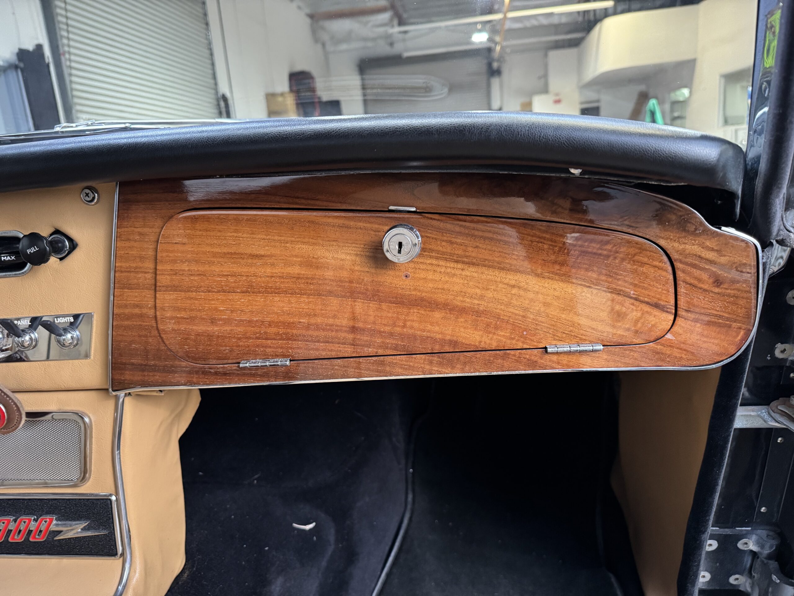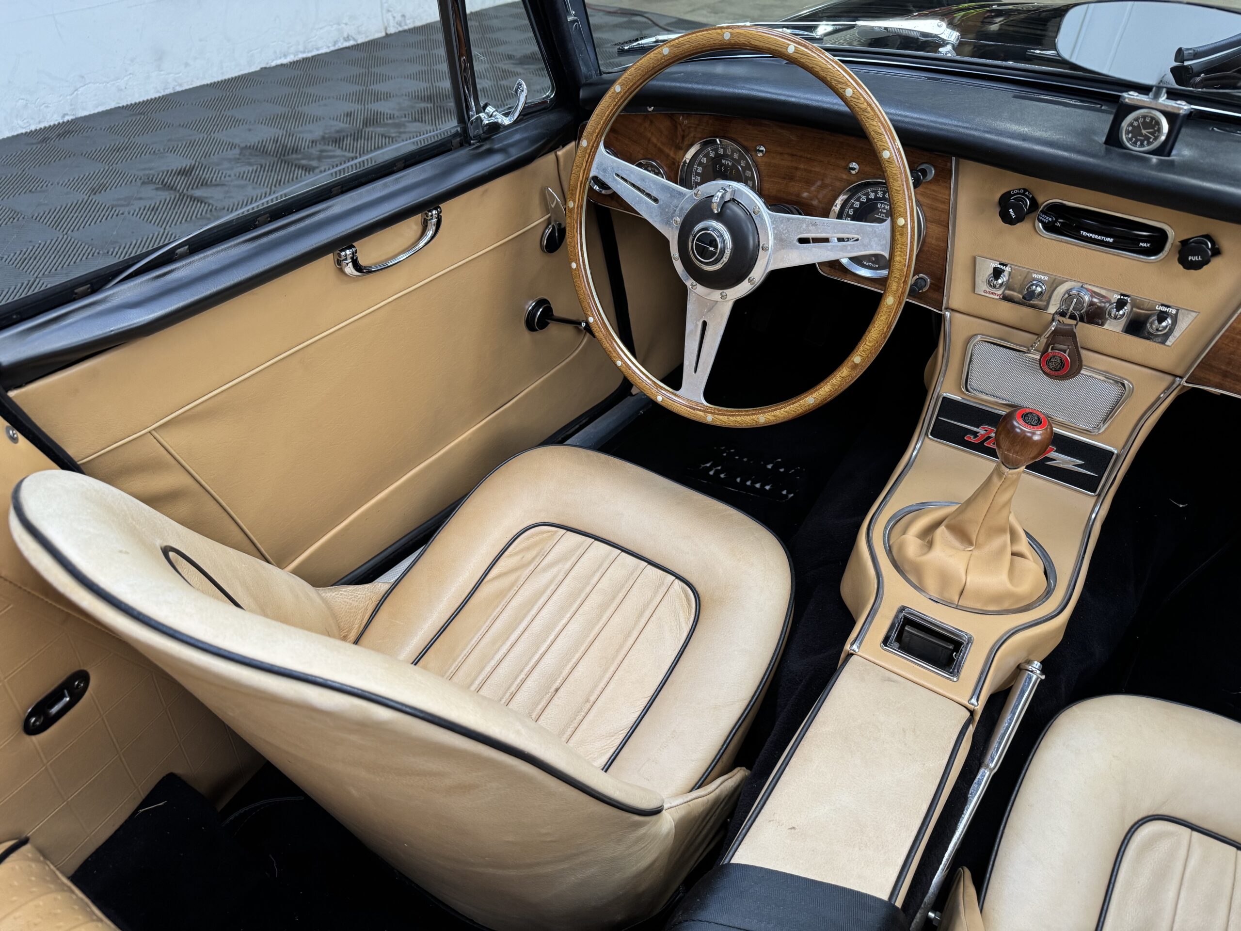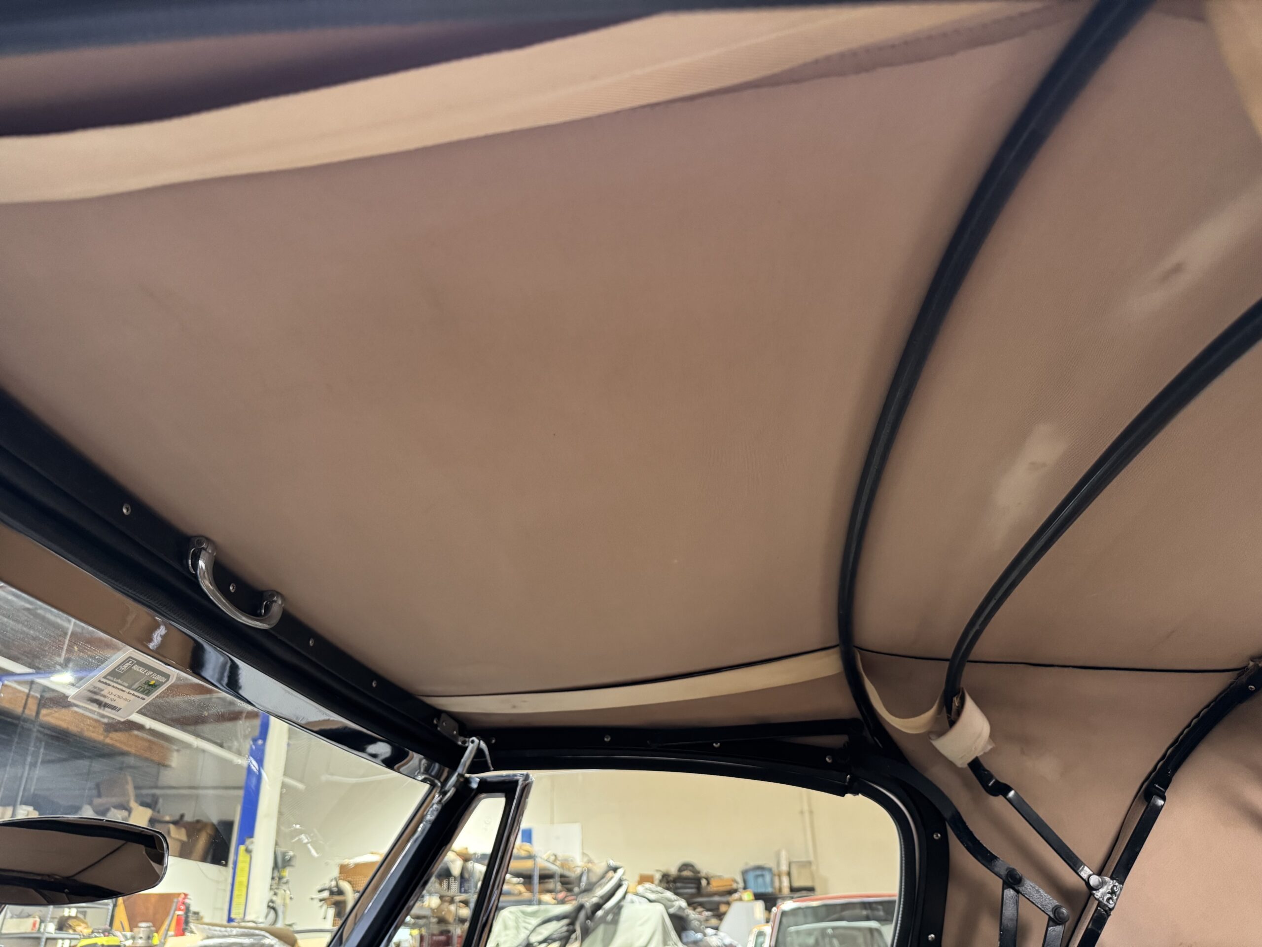 -Newer upholstery throughout including front and rear seats with foam kit, matching biscuit panel kit, black cut pile carpet kit, console, armrests, armbars, seat belts, new wooden dashboard, door seals, top seals, repainted top frame, black cloth top with matching top boot, newer wiring harness, Armacord trunk re-upholstery kit.