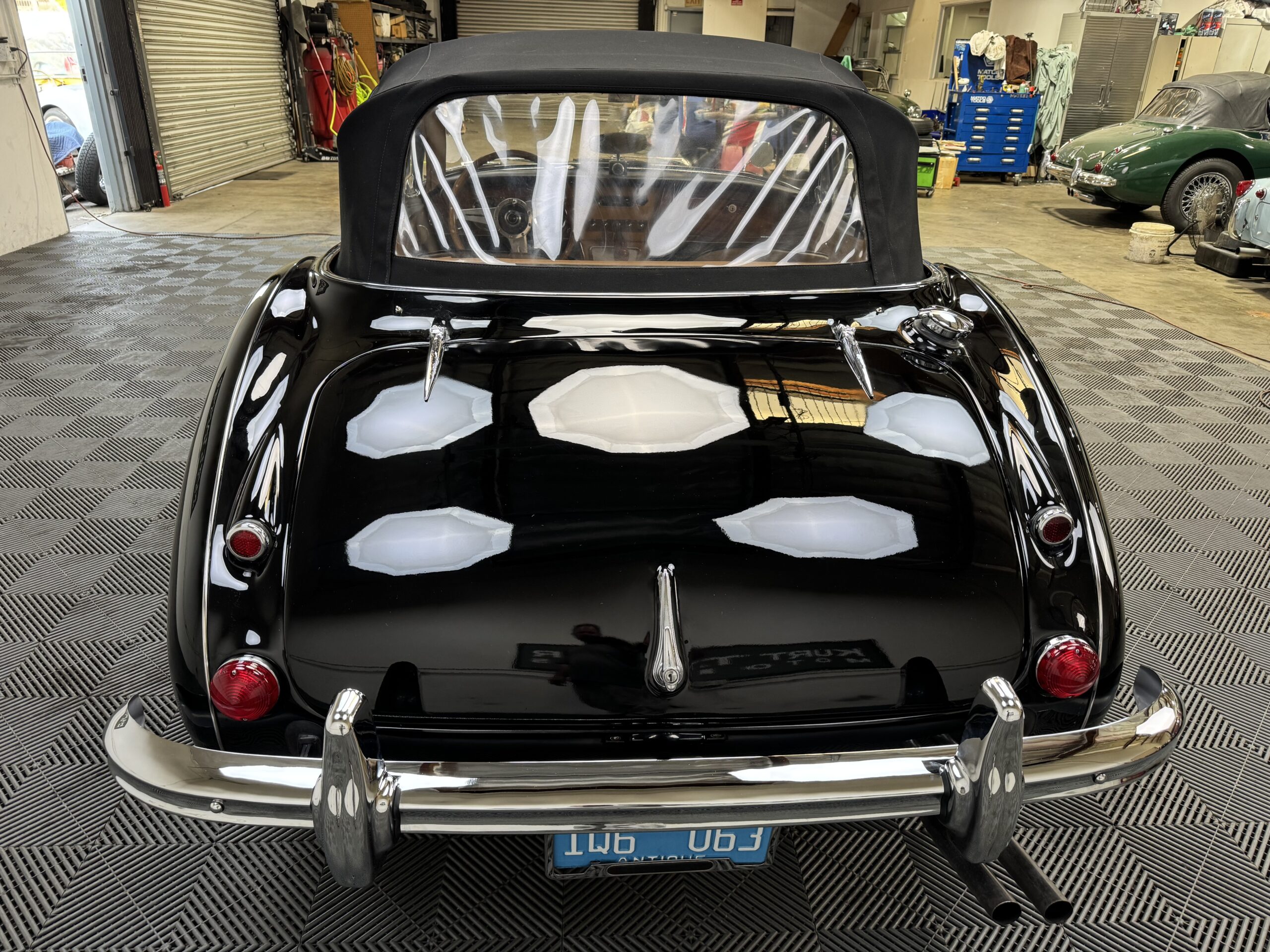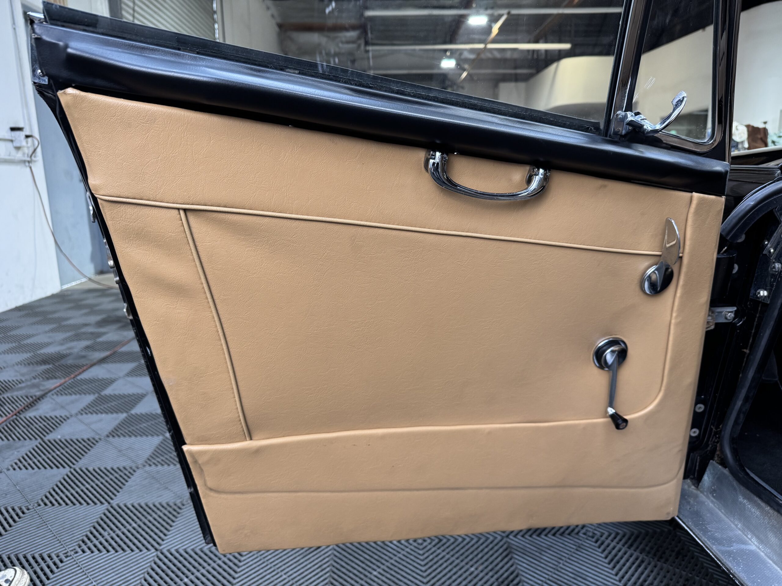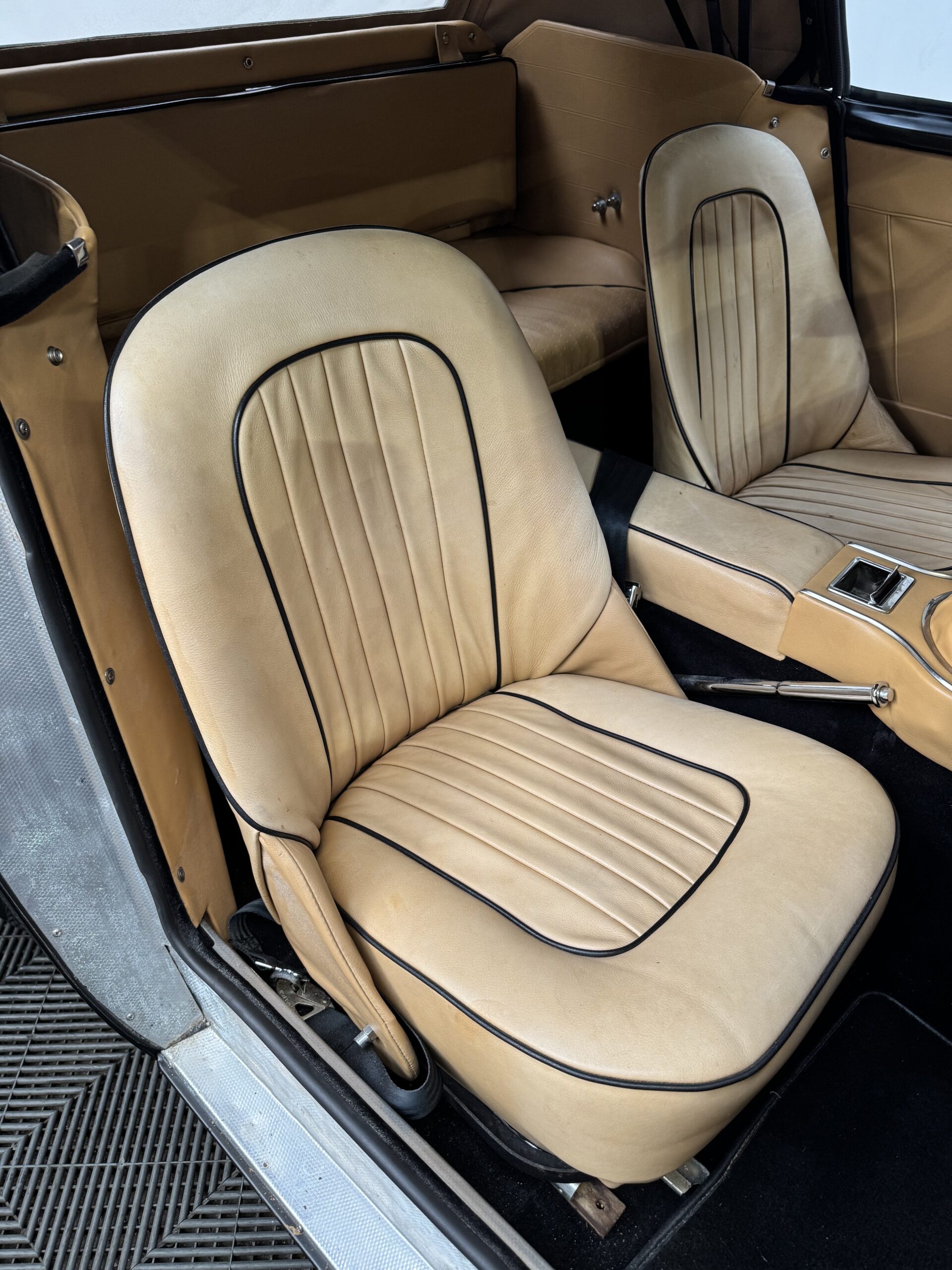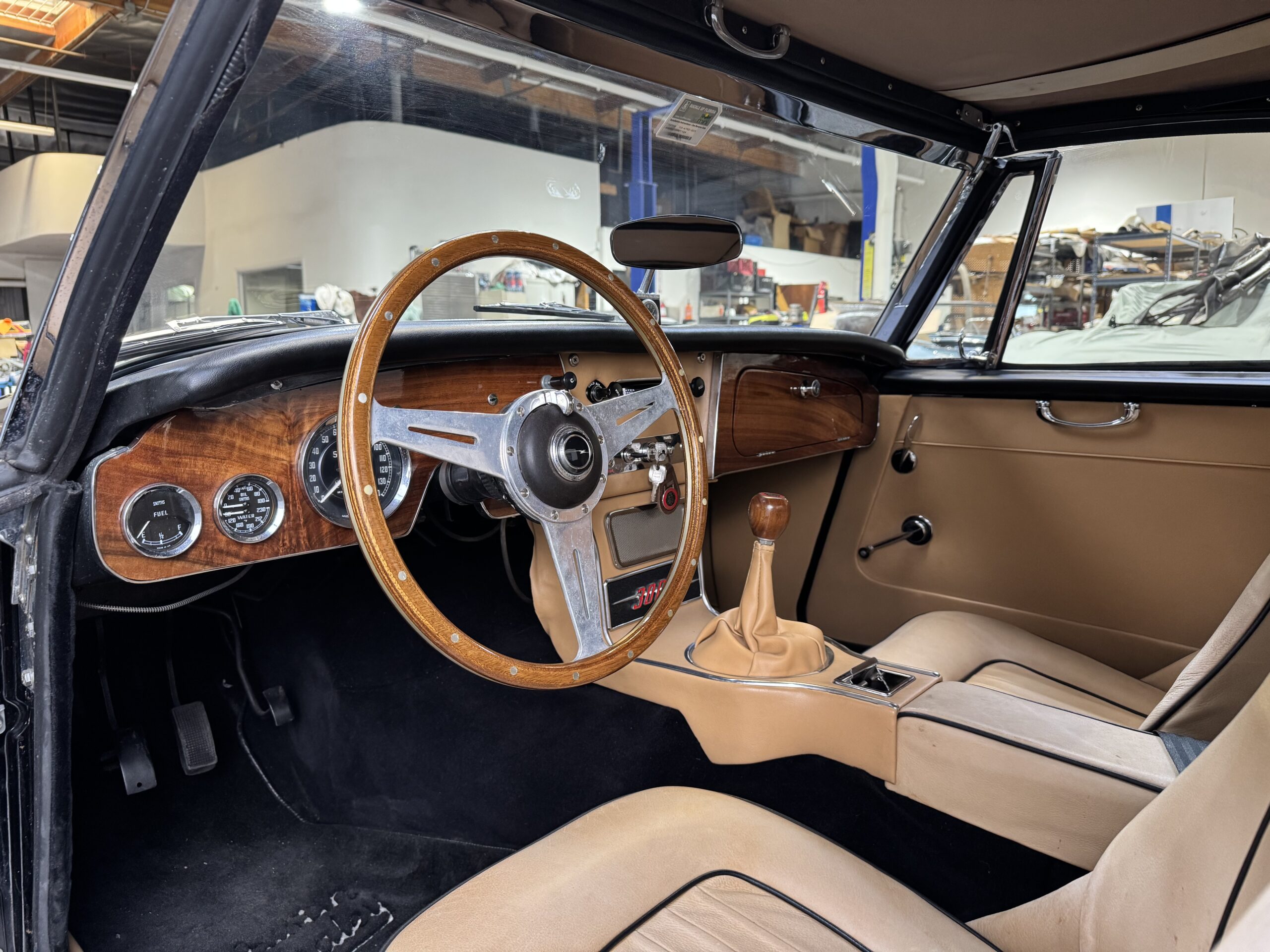 -Newer upholstery throughout including front and rear seats with foam kit, matching biscuit panel kit, black cut pile carpet kit, console, armrests, armbars, seat belts, new wooden dashboard, door seals, top seals, repainted top frame, black cloth top with matching top boot, newer wiring harness, Armacord trunk re-upholstery kit.