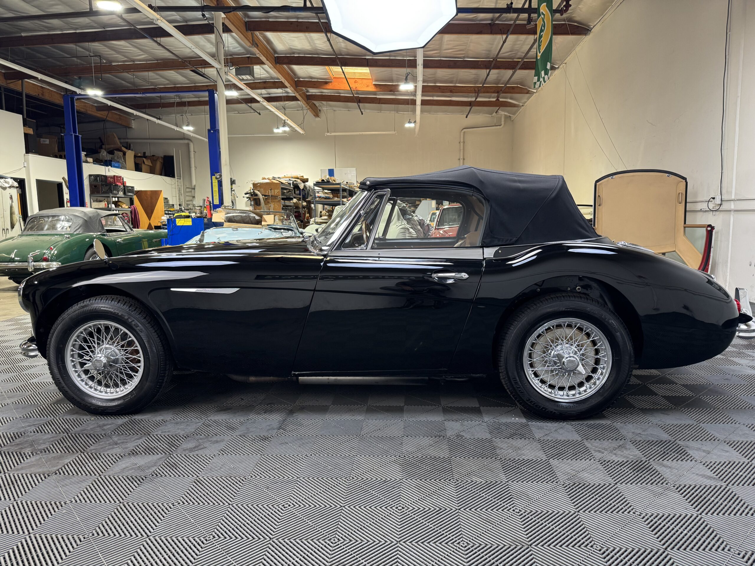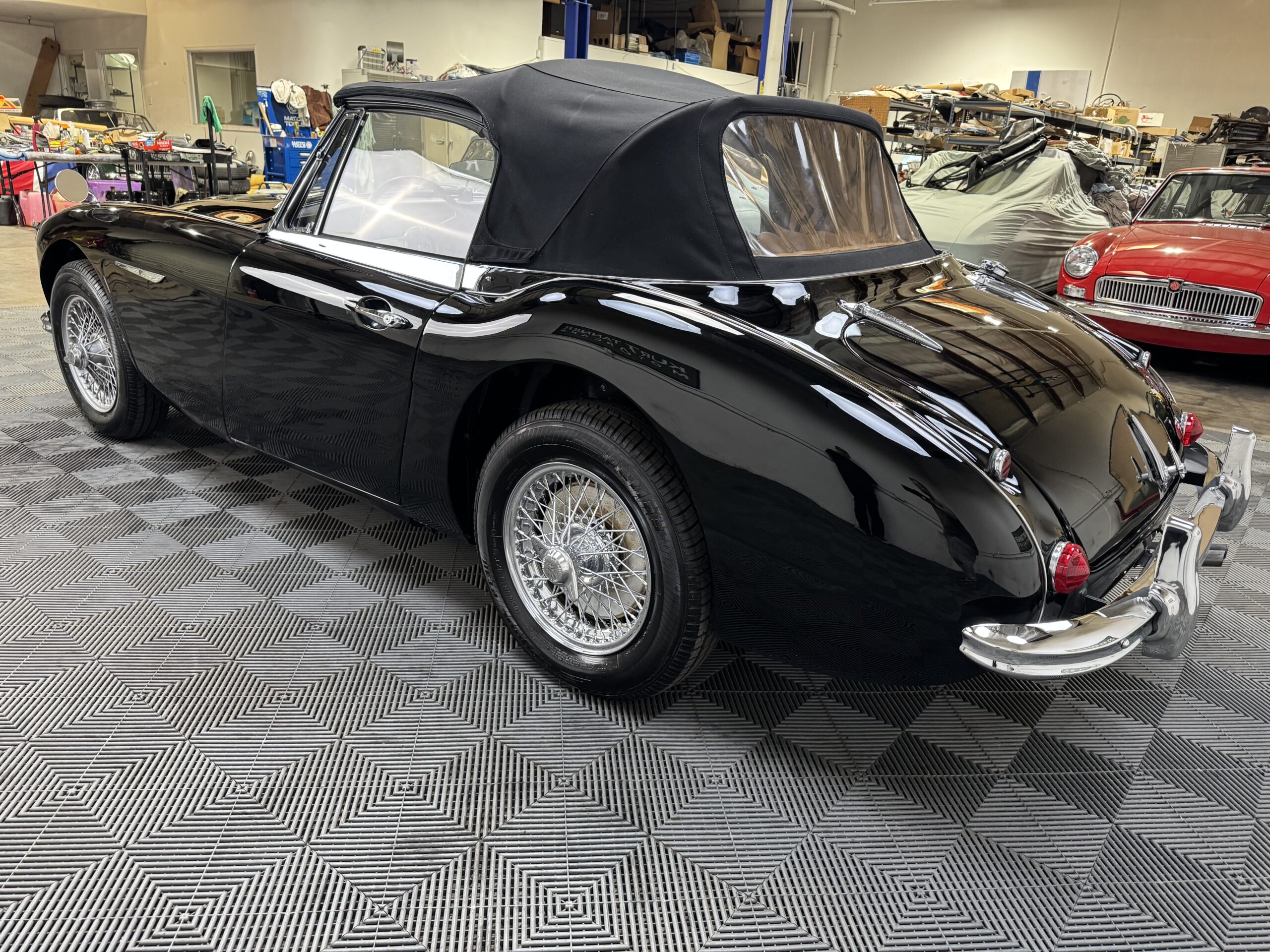 1965 AUSTIN HEALEY 3000 MK3 BJ-8 SPORTS CONVERTIBLE. BLACK WITH BISCUIT TRIM, BLACK CLOTH TOP WITH MATCHING BOOT. 4-SPEED OVERDRIVE, CHROME WIRE WHEELS, MOTOLITA WOOD WHEEL. EXCELLENT, OLDER GROUND-UP RESTORATION SHOWING 88,597 MILES.