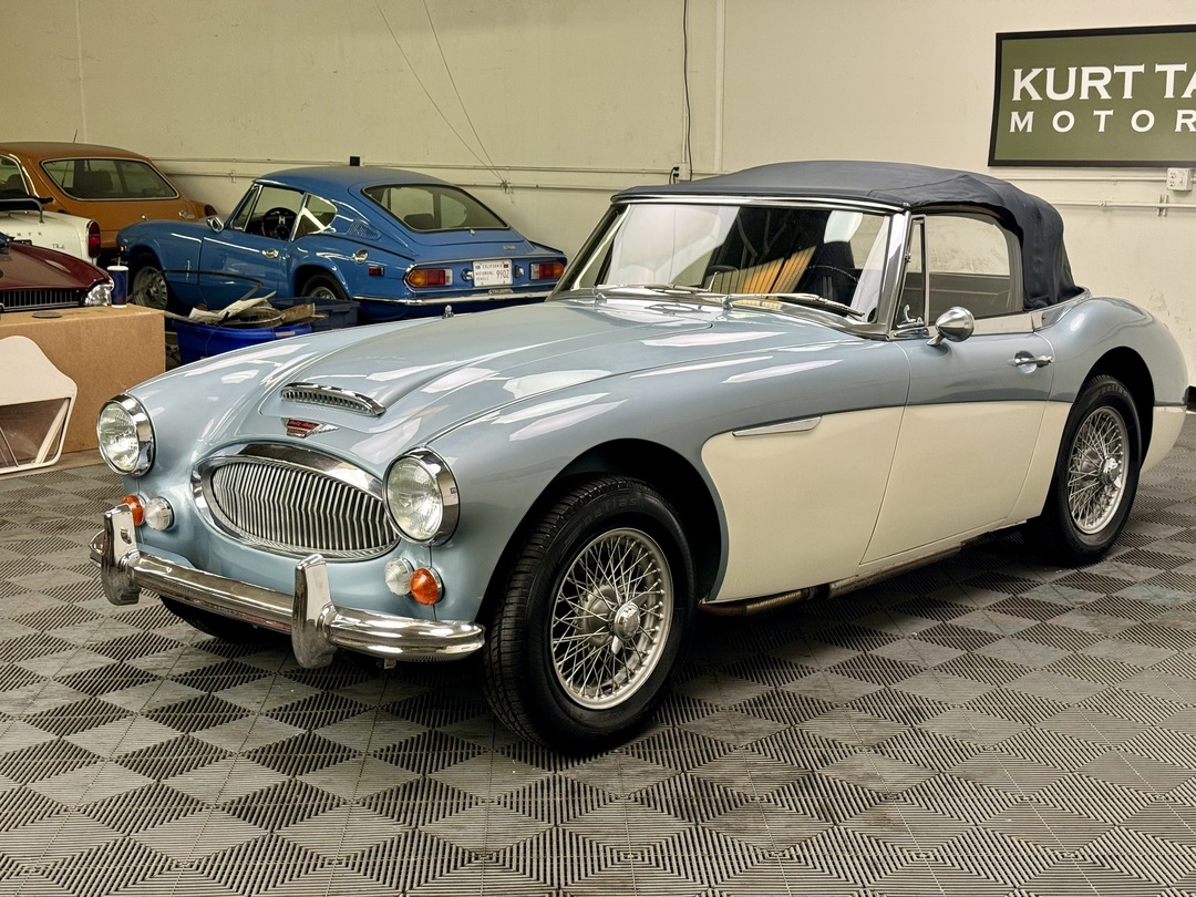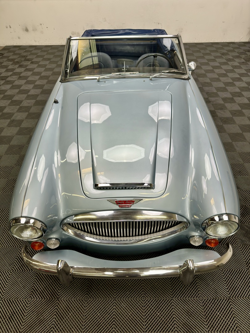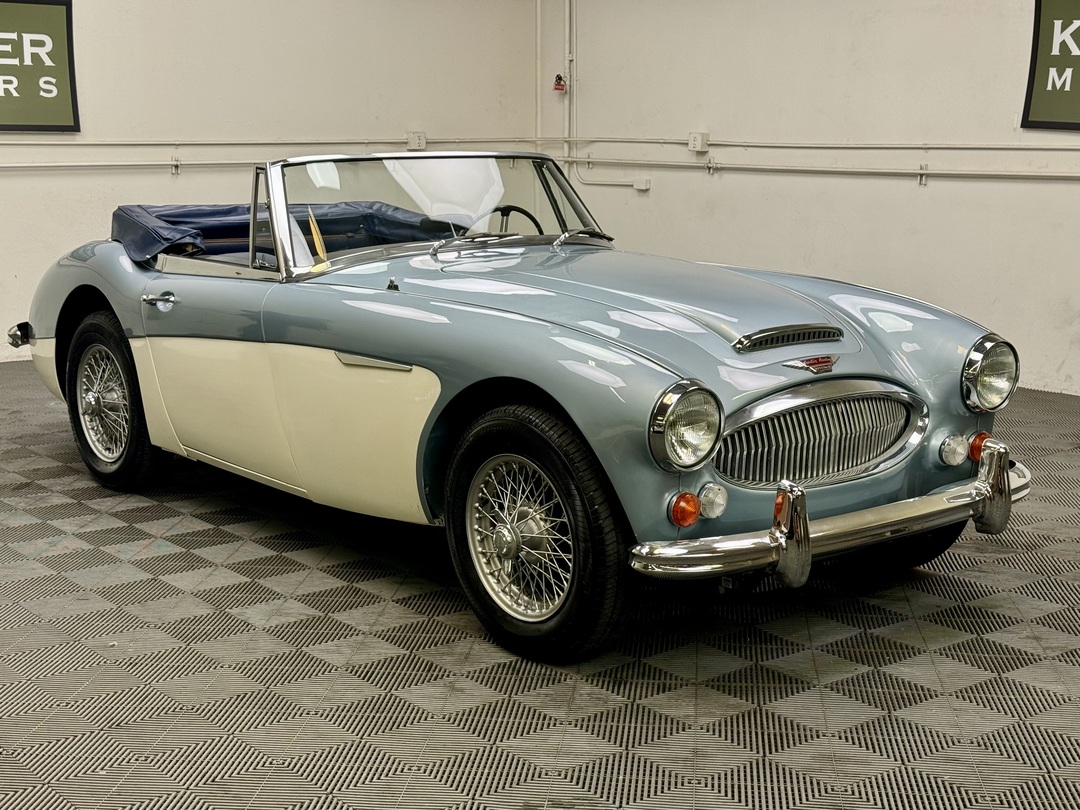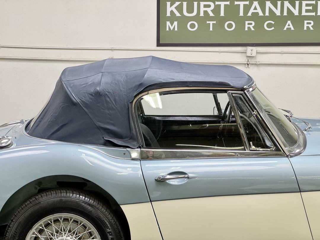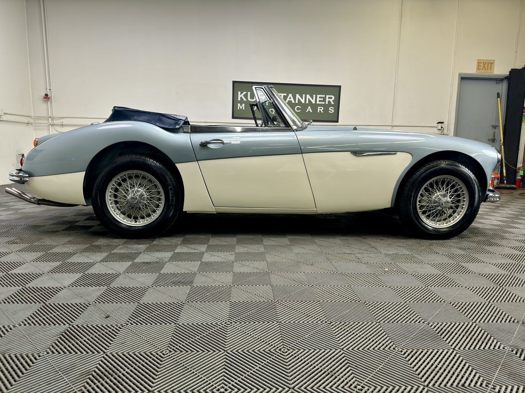 1967 AUSTIN HEALEY 3000 MK3 BJ-8 PH 2 SPORTS CONVERTIBLE. HEALEY ICE BLUE OVERY IVORY WHITE. NAVY BLUE LEATHER TRIM, TOP, TOP BOOT, TONNEAU COVER. 4-SPEED OVERDRIVE, 60-SPOKE WIRE WHEELS. OLDER GROUND UP RESTORATION. LOVELY DRIVER. BMIHT. 62,033 MILES.