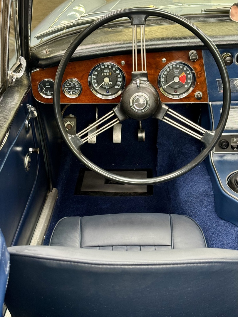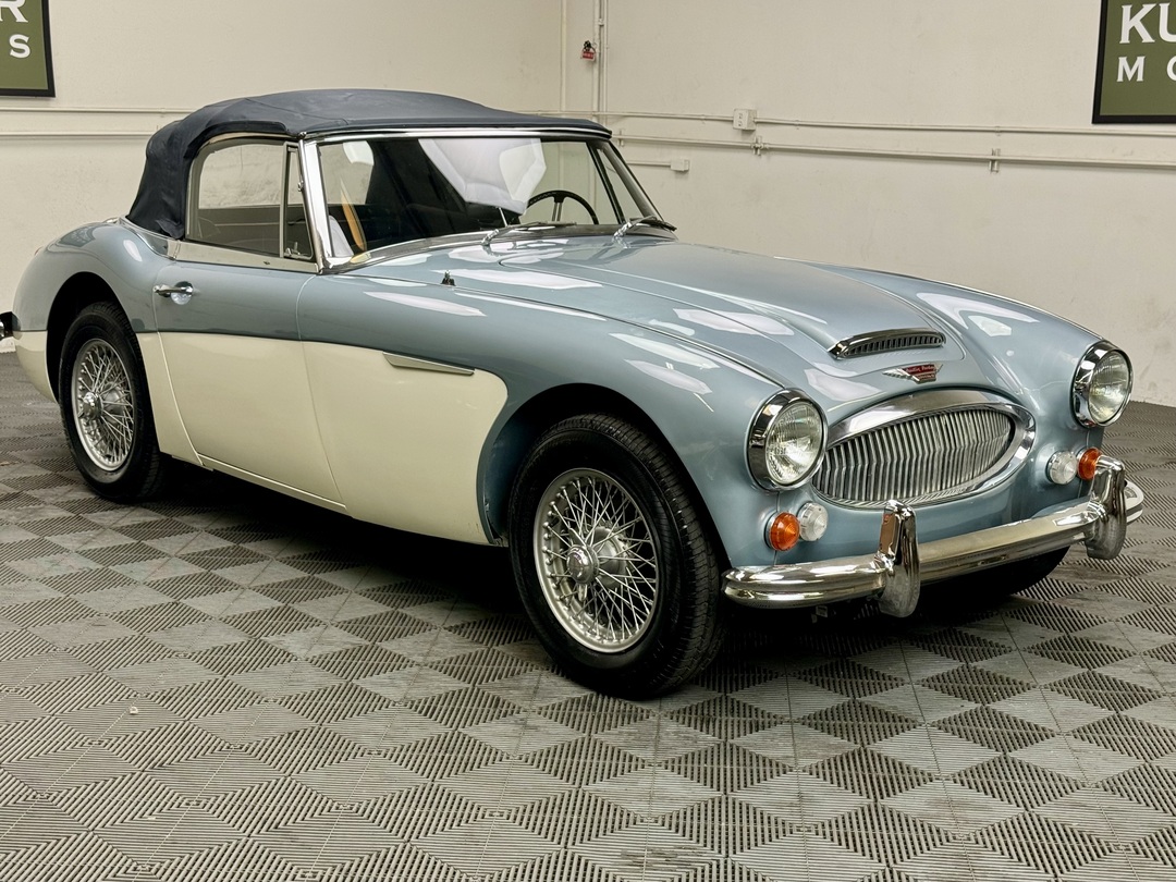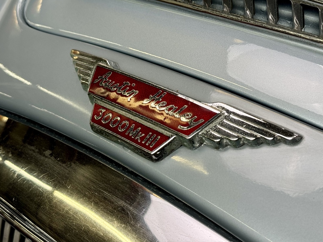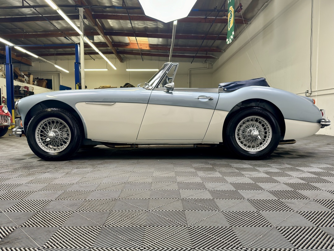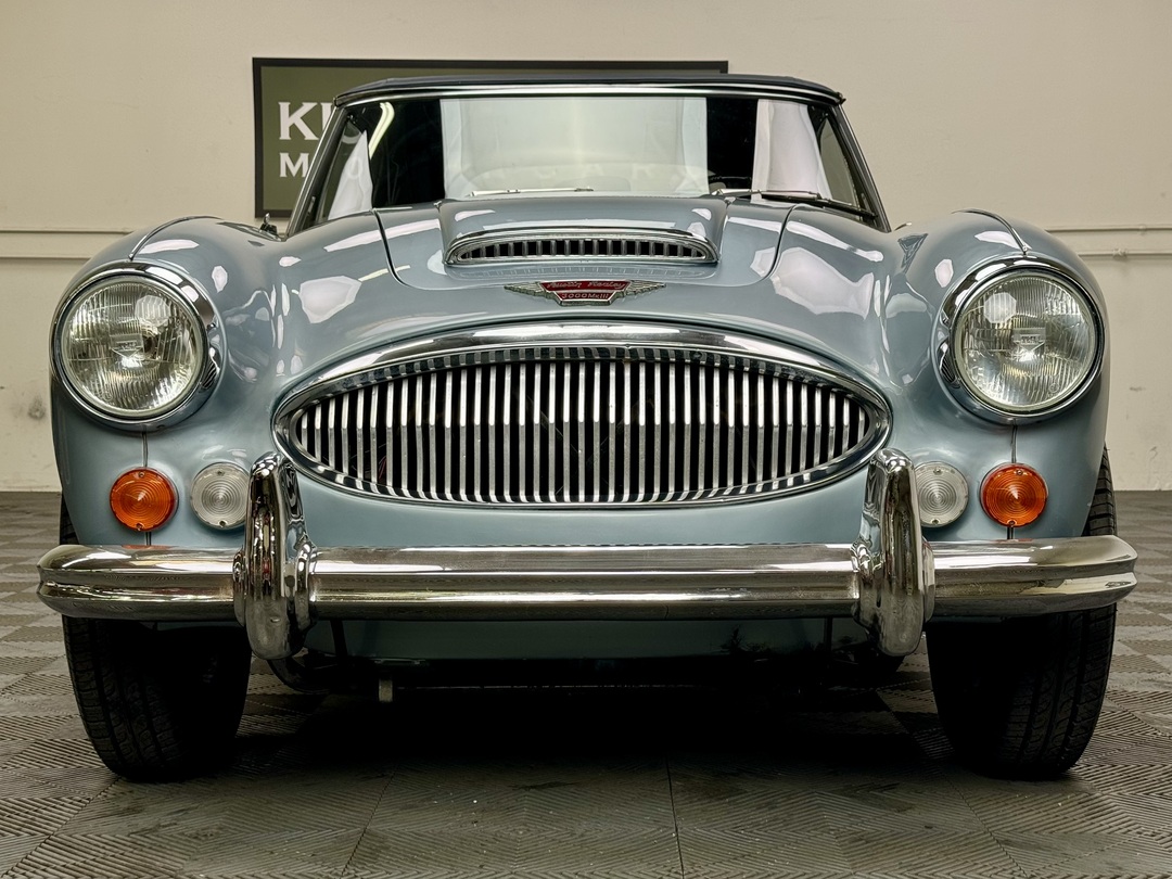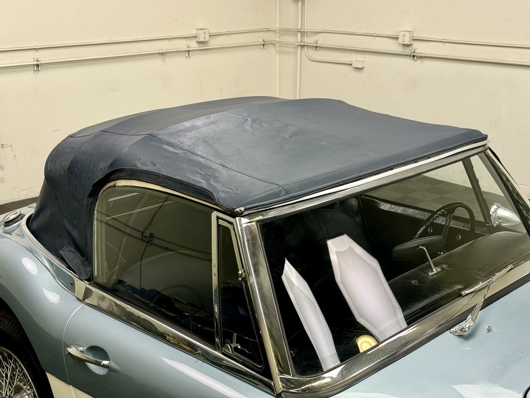 1967 AUSTIN HEALEY 3000 MK3 BJ-8 PH 2 SPORTS CONVERTIBLE. HEALEY ICE BLUE OVERY IVORY WHITE. NAVY BLUE LEATHER TRIM, TOP, TOP BOOT, TONNEAU COVER. 4-SPEED OVERDRIVE, 60-SPOKE WIRE WHEELS. OLDER GROUND UP RESTORATION. LOVELY DRIVER. BMIHT. 62,033 MILES.