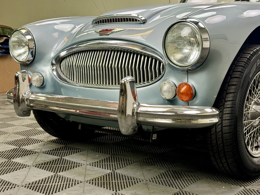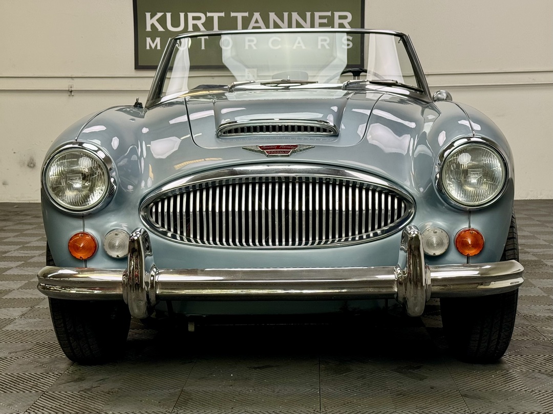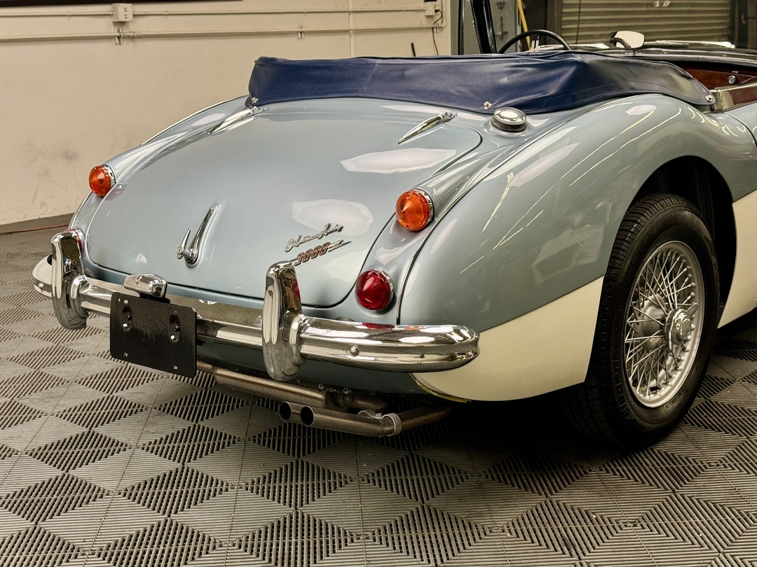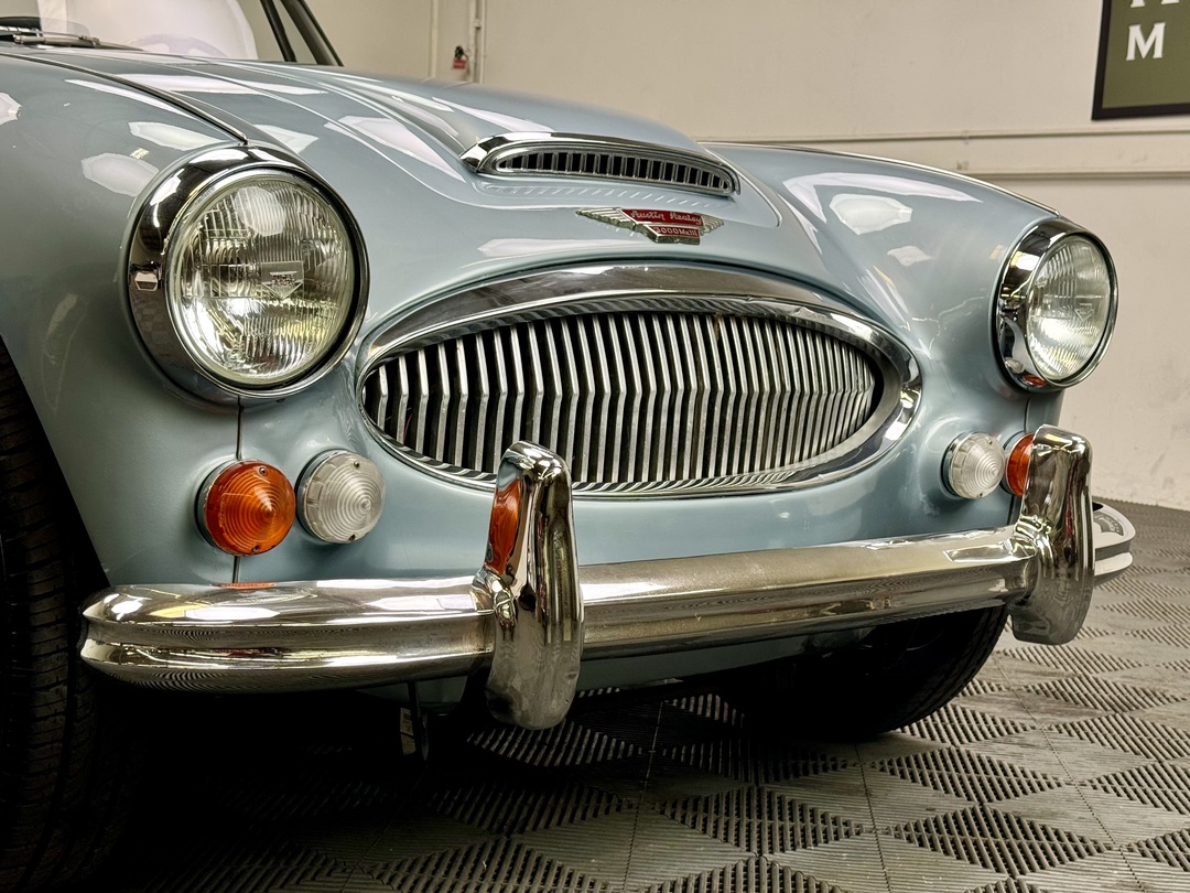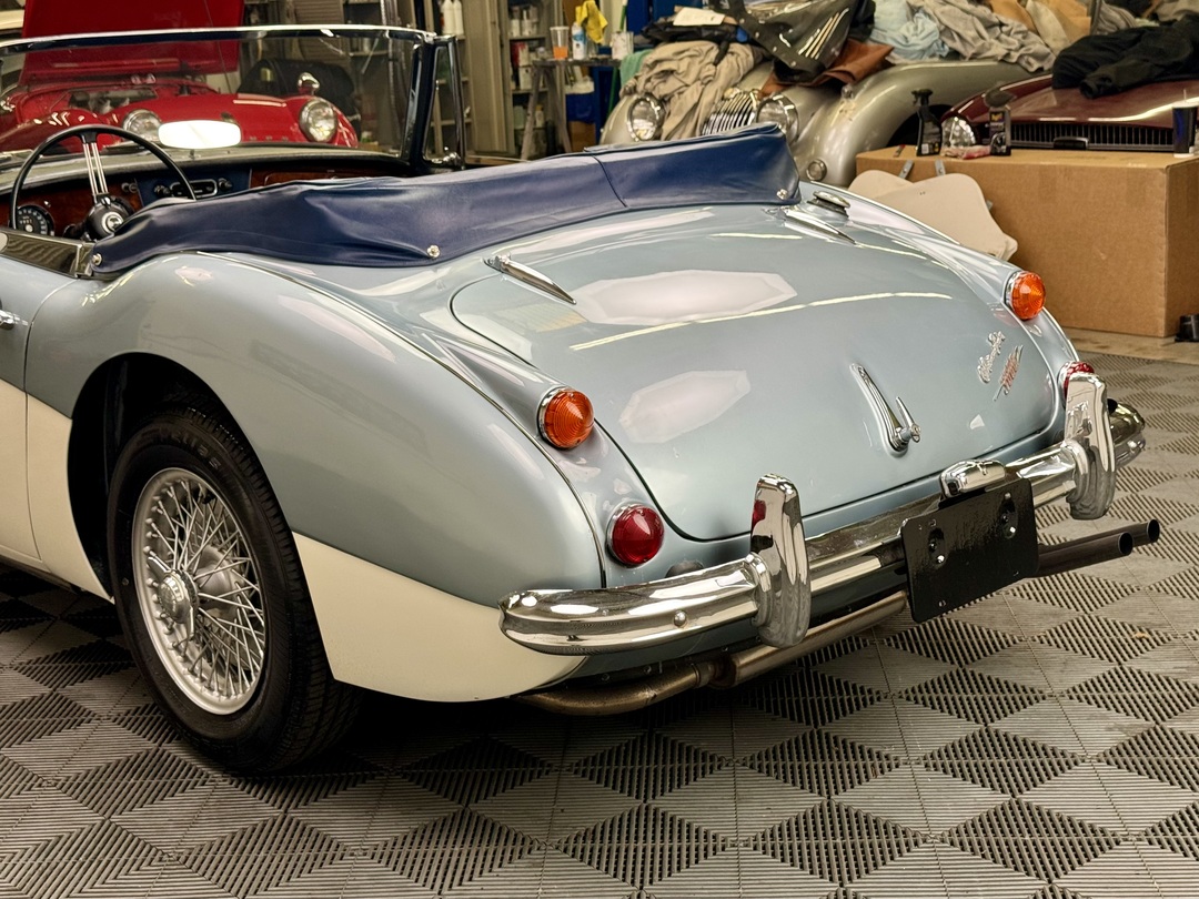 1967 AUSTIN HEALEY 3000 MK3 BJ-8 PH 2 SPORTS CONVERTIBLE. HEALEY ICE BLUE OVERY IVORY WHITE. NAVY BLUE LEATHER TRIM, TOP, TOP BOOT, TONNEAU COVER. 4-SPEED OVERDRIVE, 60-SPOKE WIRE WHEELS. OLDER GROUND UP RESTORATION. LOVELY DRIVER. BMIHT. 62,033 MILES.