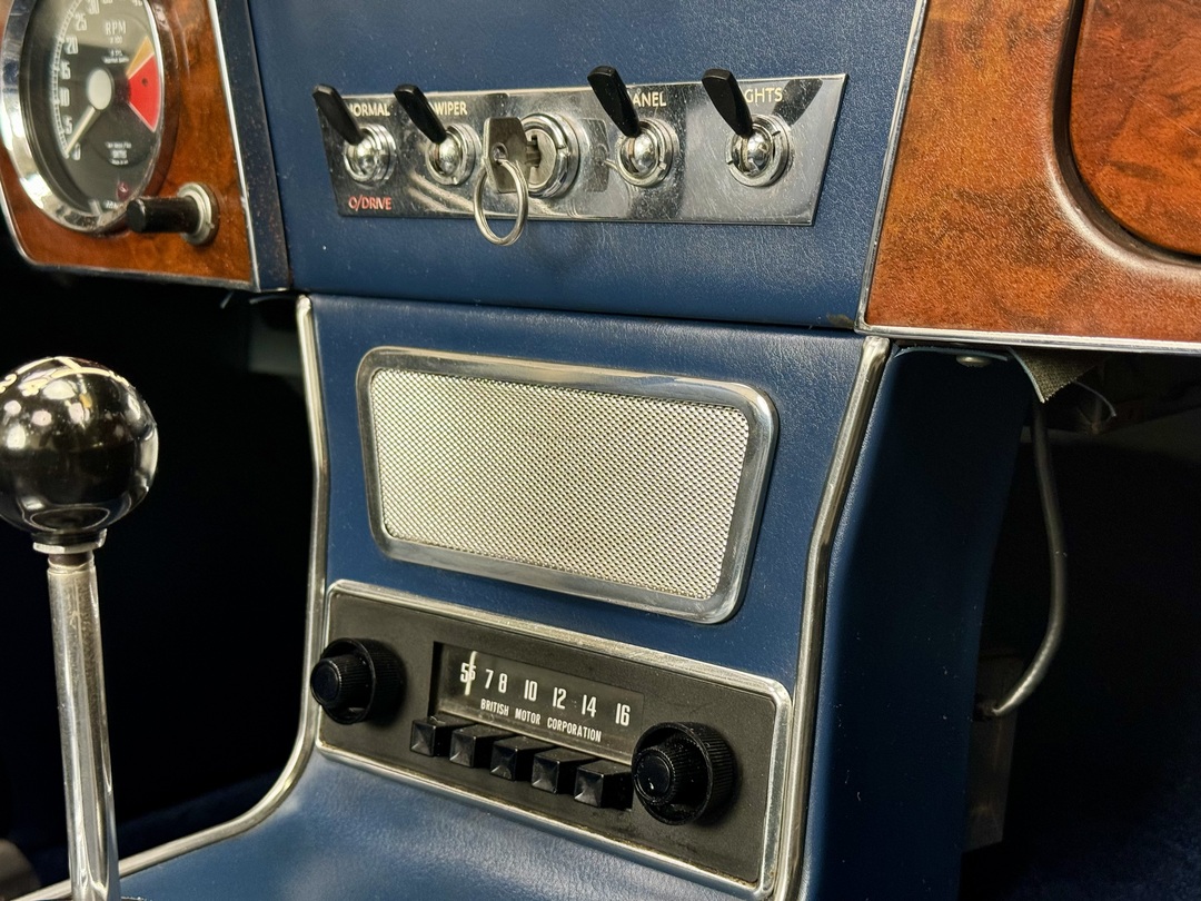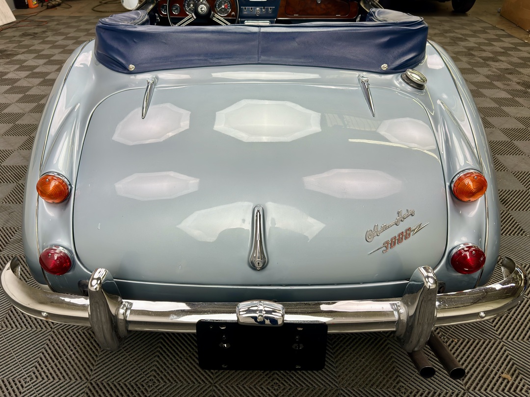 -Good older Healey Blue paint with a few small blemishes/touch-ups. Freshly painted Ivory insert. Good original chromework, windshield and door glass. Very good dash wood. Original BMC radio. Decent older soft top. Excellent Everflex tonneau cover. PLEASE SEE WALK AROUND VIDEO.