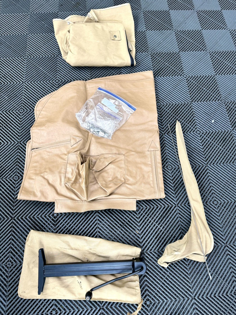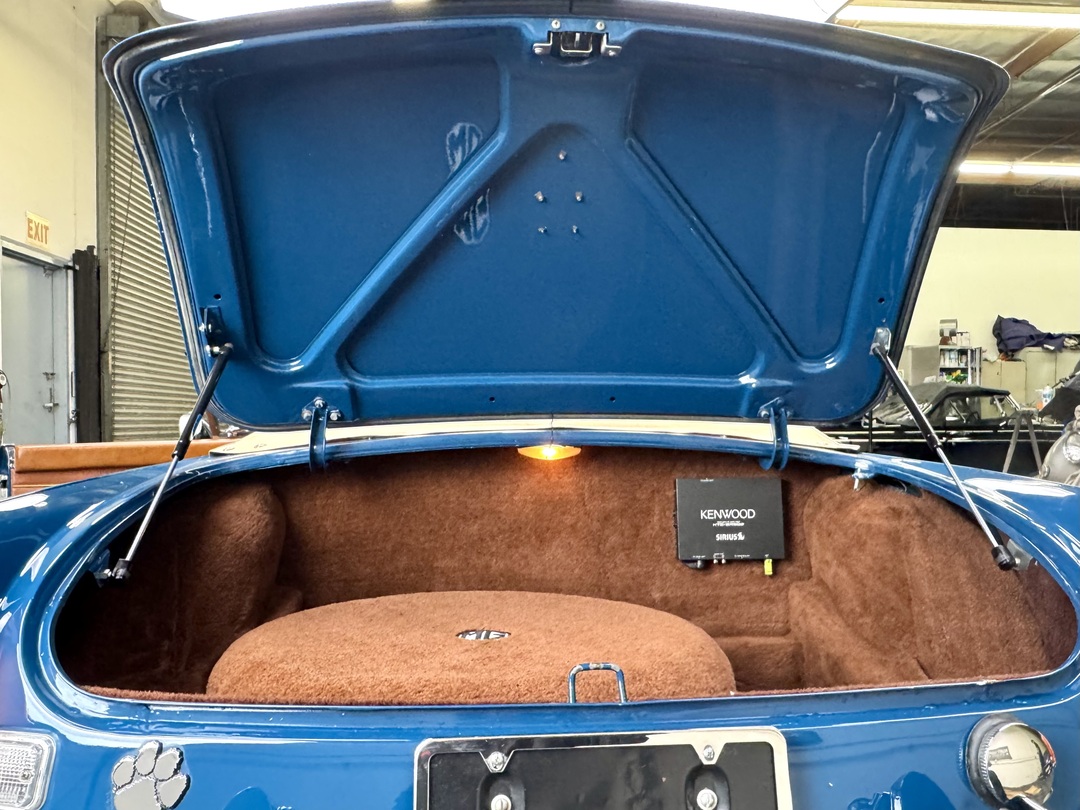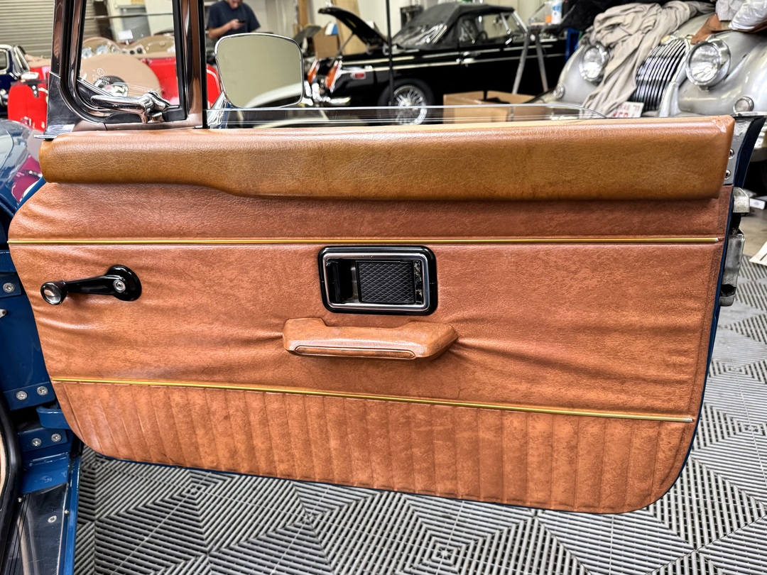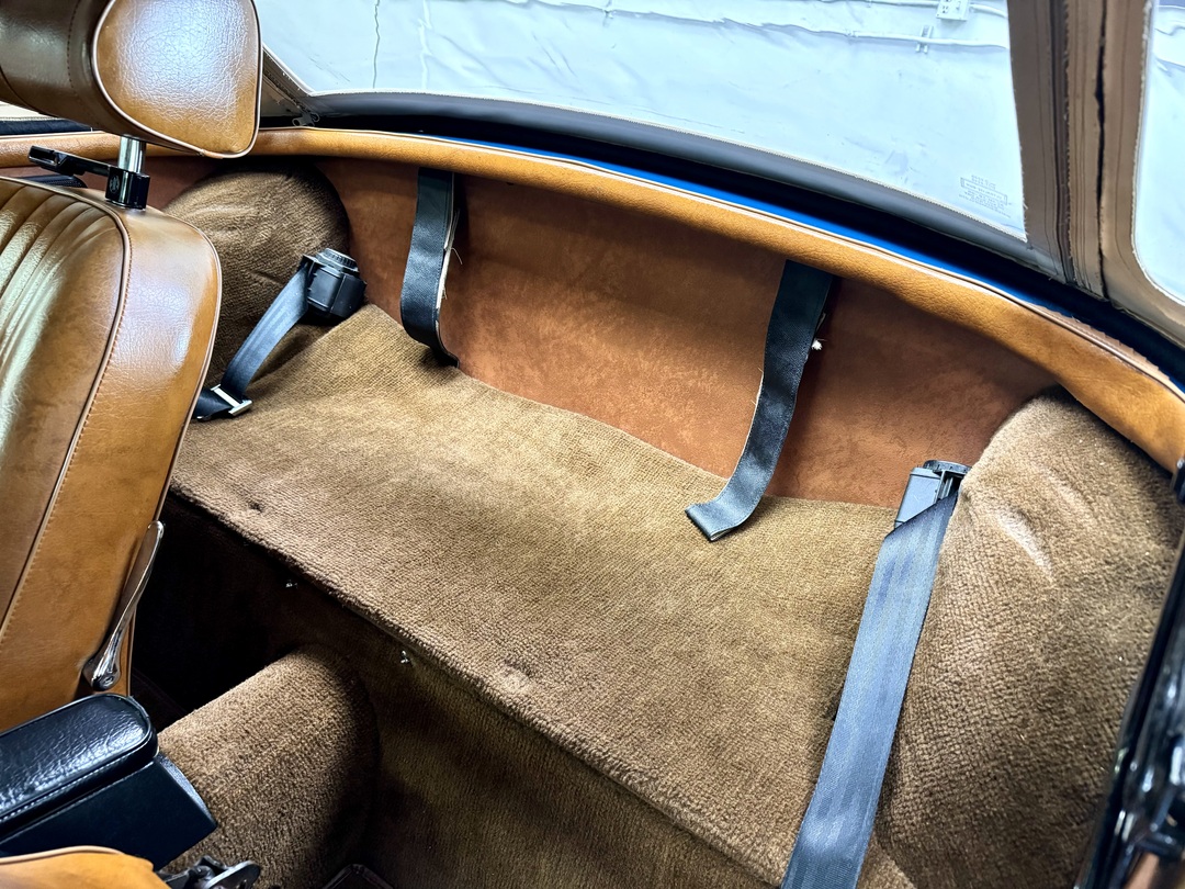 -Excellent restored interior with a perfect dashboard and console, custom wood/alloy steering wheel, restored seat set, new carpets, excellent original panel kit, Kenwood sound system, newer cloth biscuit top, upgraded trunk carpet set, OEM door mirrors. PLEASE SEE WALK AROUND VIDEO.